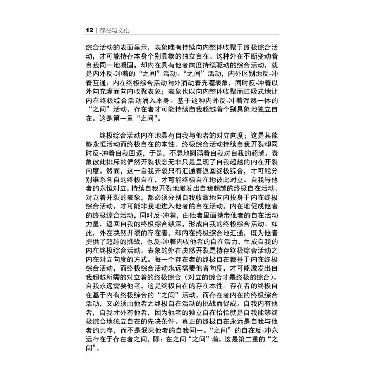 存在不過是終極自在的永恆活動;基於自我/他者的反-沖性終極綜合,活動永不休止地自我超越,那就是存在。人類經由三個基本文化進路而通達存在,就彼此交織地反-沖著共鳴於存在本身的“圓”性終極綜合活動。這三個基本文化進路是:發端于地中海地區的橫向平推的抽象文化,起源於“兩河流域”的縱向直通的一神論文化,生發於東亞大陸的“圓”性迴圈的個別具象文化(作為“天”創自然文化的典範)。