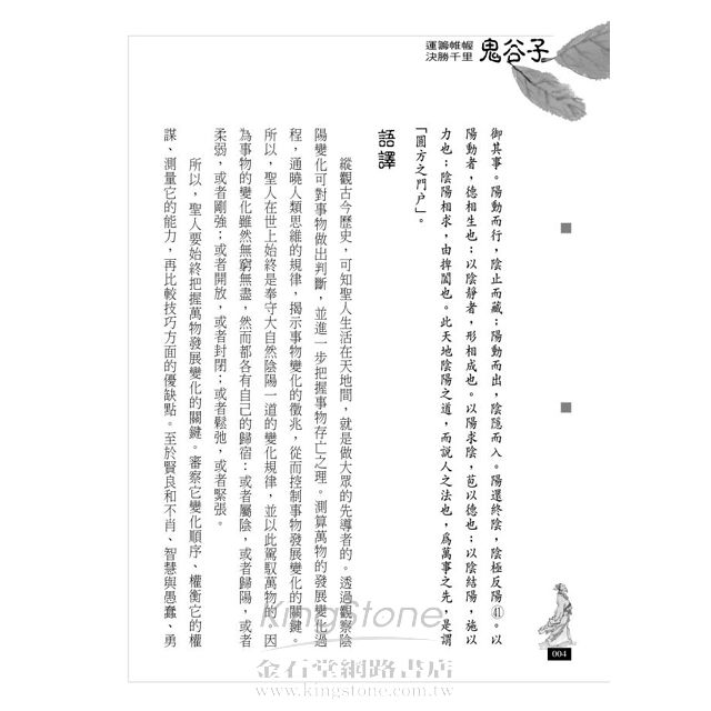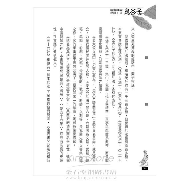 本書傳承歷史、綿延文化,擷取其兵書精華,讓芸芸眾生,能回朔千百年來,雲起龍驤、波譎雲詭的時空浩涯中,頓悟啓蒙一窺堂奧。