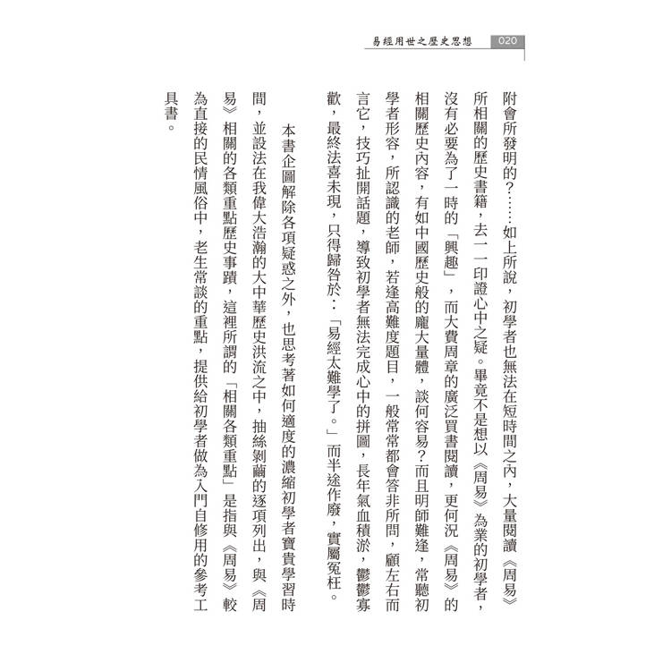 •精選《周易》相關歷史為背景,藉時間為主軸,用朝代為發展脈源,依序排列《周易》組織結構中的重點紀事。