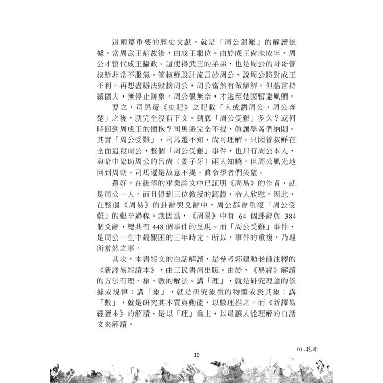 其次,本書經文的白話解讀,是參考郭建勳老師注釋的《新譯易經讀本》,由三民書局出版。由於,《易經》解讀的方法有理、象、數的解法。講「理」,就是研究理論的依據或規律;講「象」,就是研究象徵的物體或表其象;講「數」,就是研究其本質與動能,以數理推之。而《新譯易經讀本》的解讀,是以「理」為主,以最讓人能理解的白話文來解讀。