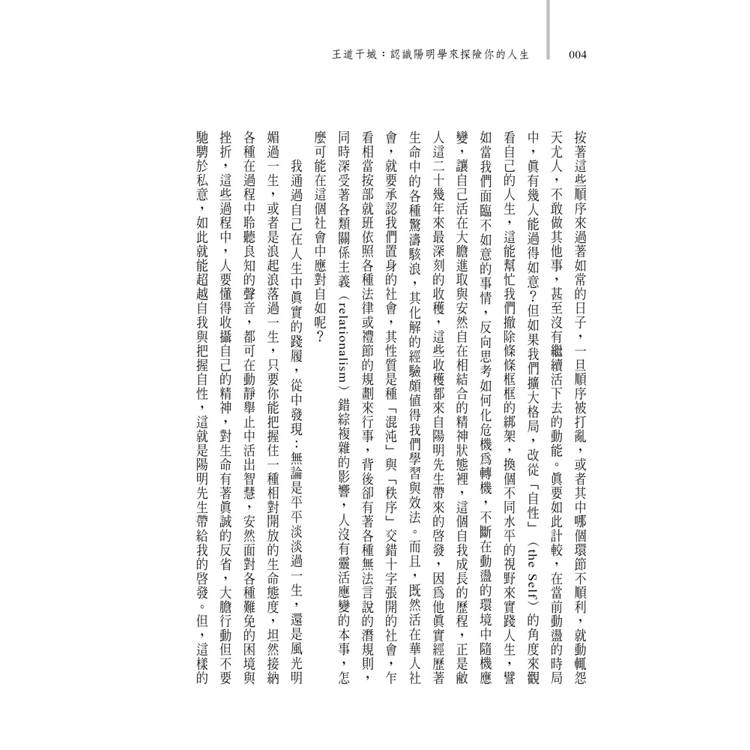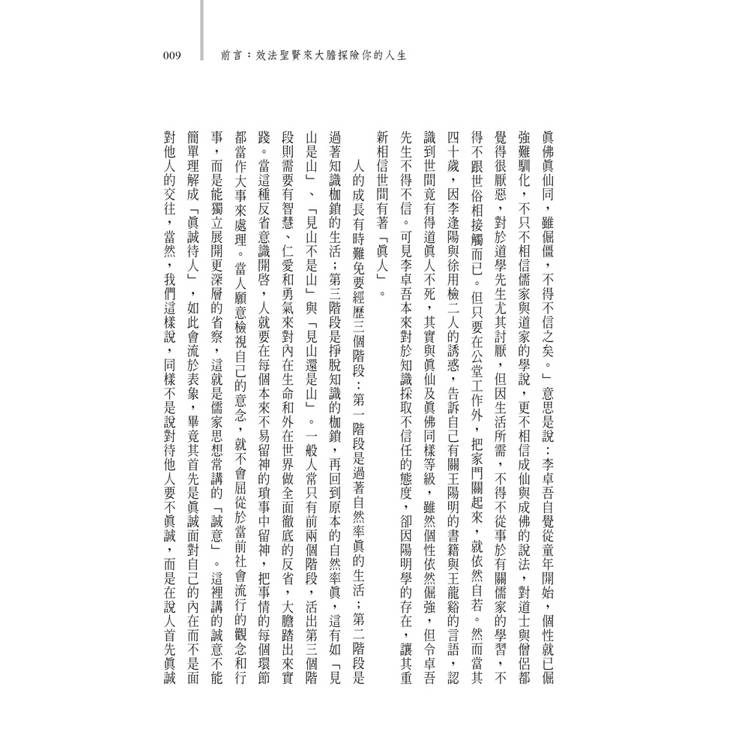 在文明衝突日益激烈,世界格局正面臨重整的關鍵時刻,人不能只是追逐流行時尚,心中卻沒有羅盤與南針,這本書旨在告訴世人:置身亂世,陽明學不啻是治人心疾的一帖良藥,認識其間的觀念與做法,有益於你來探險自己的人生。