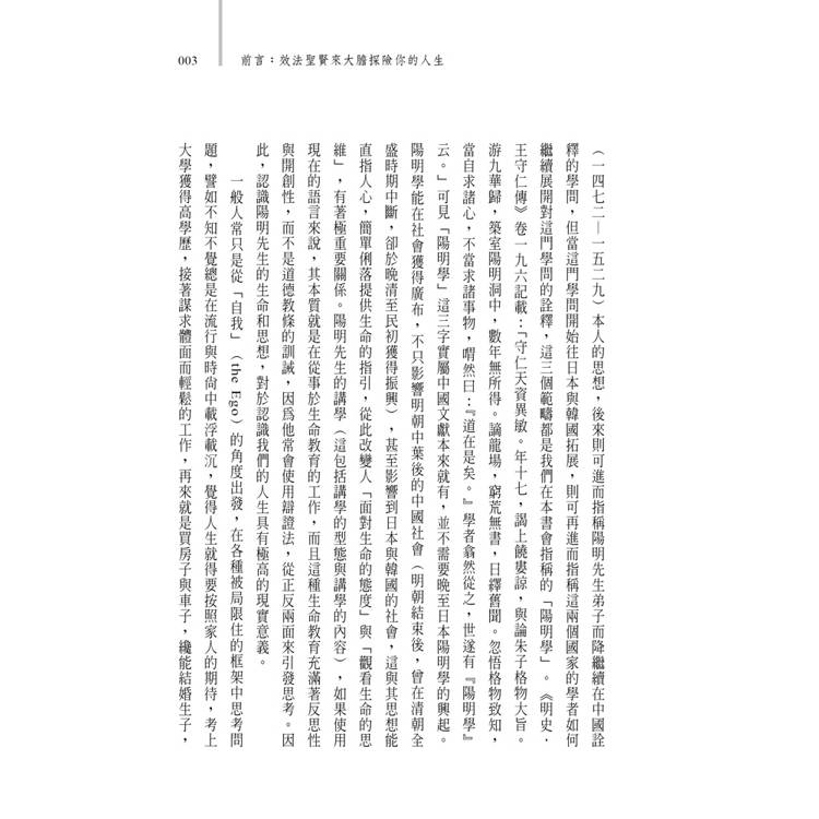 本書是學術著作,不過重點在使用較通俗的觀念與用語來跟大學同學與社會人士談「陽明學」,但因我們始終要對讀者負責,重要觀點還是會使用註釋,裨益讀者按圖索驥自行查考。開宗明義來說,陽明學就是心學,這首先是指心學宗師王陽明先生(一四七二—一五二九)本人的思想,後來則可進而指稱陽明先生弟子而降繼續在中國詮釋的學問,但當這門學問開始往日本與韓國拓展,則可再進而指稱這兩個國家的學者如何繼續展開對這門學問的詮釋,這三個範疇都是我們在本書會指稱的「陽明學」。《明史‧王守仁傳》卷一九六記載:「守仁天資異敏。年十七,謁上饒婁諒,與論朱子格物大旨。游九華歸,築室陽明洞中,數年無所得。謫龍場,窮荒無書,日繹舊聞。忽悟格物致知,當自求諸心,不當求諸事物,喟然曰:『道在是矣。』學者翕然從之,世遂有『陽明學』云。」可見「陽明學」這三字實屬中國文獻本來就有,並不需要晚至日本陽明學的興起。陽明學能在社會獲得廣佈,不只影響明朝中葉後的中國社會(明朝結束後,曾在清朝全盛時期中斷,卻於晚清至民初獲得振興),甚至影響到日本與韓國的社會,這與其思想能直指人心,簡單俐落提供生命的指引,從此改變人「面對生命的態度」與「觀看生命的思維」,有著極重要關係。陽明先生的講學(這包括講學的型態與講學的內容),如果使用現在的語言來說,其本質就是在從事於生命教育的工作,而且這種生命教育充滿著反思性與開創性,而不是道德教條的訓誡,因為他常會使用辯證法,從正反兩面來引發思考。因此,認識陽明先生的生命和思想,對於認識我們的人生具有極高的現實意義。