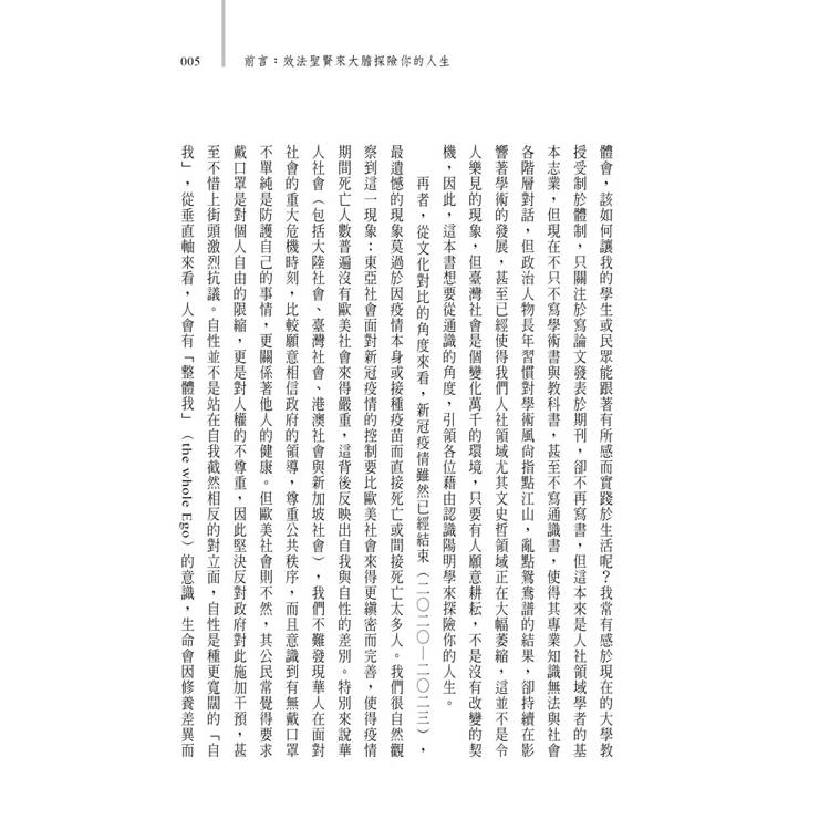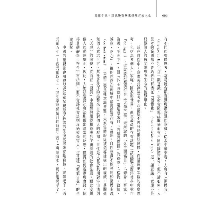 再者,這本書期待關注時局的社會人士閱讀,除同樣可搭配觀看磨課師課程來學習外,值得有識者思考:東亞陽明學曾經是各國社會革新的思想引擎,我們是否還能汲取其內容,在對話中繼續創新,引領改革國家政治,召喚天下大同?