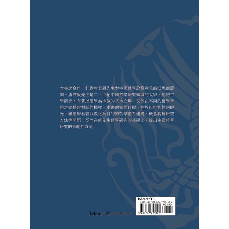 本書之寫作,針對唐君毅先生對中國哲學詮釋意見的反思而展開。唐君毅先生是二十世紀中國哲學研究領域的大家,他的哲學研究,有著以儒學為本位的基本立場,又能在不同的哲學學派之間搭建對話的橋樑。本書的寫作目標,在於以批判性的眼光,審思唐君毅以教化為目的的哲學體系建構、概念範疇研究方法等問題,從而在唐先生哲學研究的基礎上,提出中國哲學研究的系統性方法。