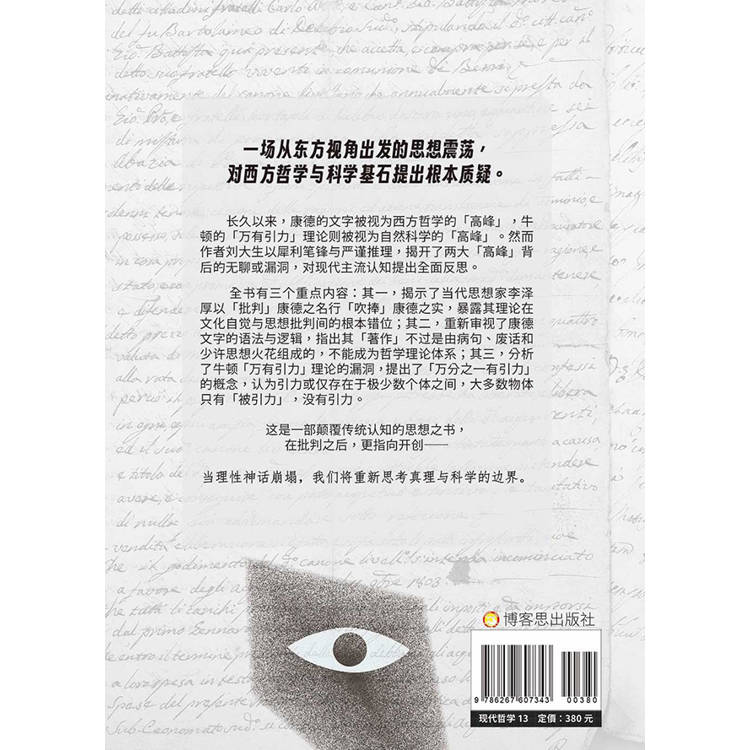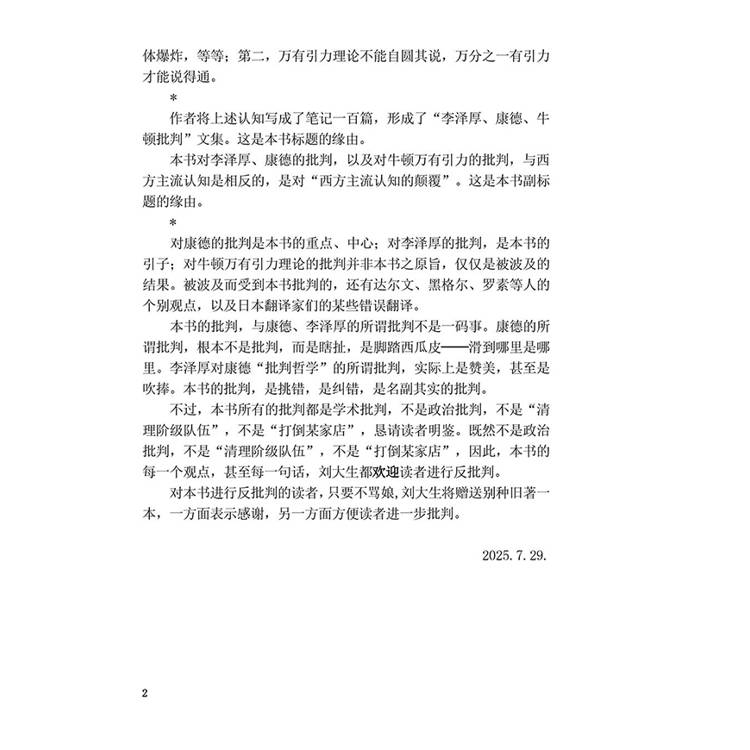 * 对康德的批判是本书的重点、中心;对李泽厚的批判,是本书的引子;对牛顿万有引力理论的批判并非本书之原旨,仅仅是被波及的结果。被波及而受到本书批判的,还有达尔文、黑格尔、罗素等人的个别观点,以及日本翻译家们的某些错误翻译。 本书的批判,与康德、李泽厚的所谓批判不是一码事。康德的所谓批判,根本不是批判,而是瞎扯,是脚踏西瓜皮——滑到哪里是哪里。李泽厚对康德“批判哲学”的所谓批判,实际上是赞美,甚至是吹捧。本书的批判,是挑错,是纠错,是名副其实的批判。   不过,本书所有的批判都是学术批判,不是政治批判,不是“清理阶级队伍”,不是“打倒某家店”,恳请读者明鉴。既然不是政治批判,不是“清理阶级队伍”,不是“打倒某家店”,因此,本书的每一个观点,甚至每一句话,刘大生都欢迎读者进行反批判。