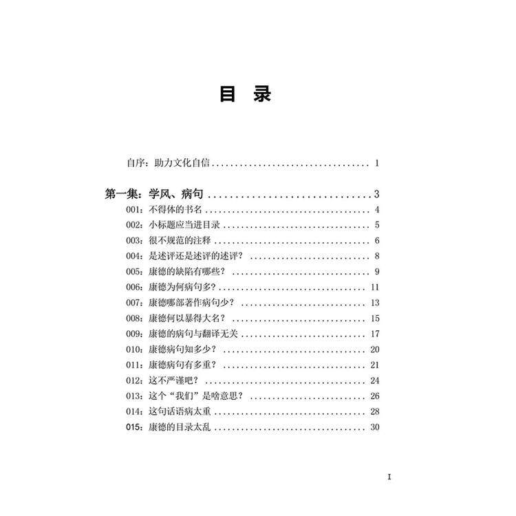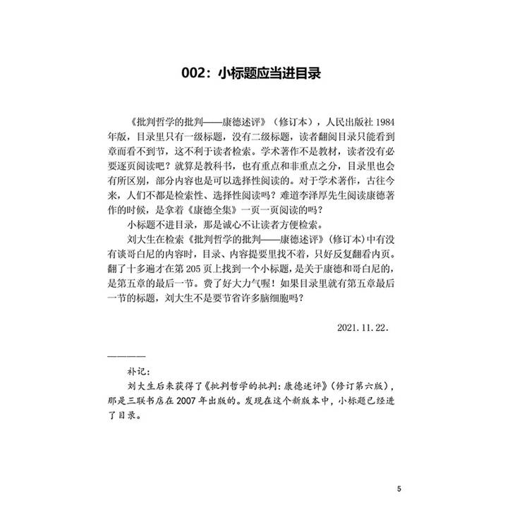 《批判哲学的批判——康德述评》(修订本),人民出版社1984年版,目录里只有一级标题,没有二级标题,读者翻阅目录只能看到章而看不到节,这不利于读者检索。学术著作不是教材,读者没有必要逐页阅读吧?就算是教科书,也有重点和非重点之分,目录里也会有所区别,部分内容也是可以选择性阅读的。对于学术著作,古往今来,人们不都是检索性、选择性阅读吗?难道李泽厚先生阅读康德著作的时候,是拿着《康德全集》一页一页阅读的吗? 小标题不进目录,那是诚心不让读者方便检索。 刘大生在检索《批判哲学的批判——康德述评》(修订本)中有没有谈哥白尼的内容时,目录、内容提要里找不着,只好反复翻看内页。翻了十多遍才在第205页上找到一个小标题,是关于康德和哥白尼的,是第五章的最后一节。费了好大力气喔!如果目录里就有第五章最后一节的标题,刘大生不是要节省许多脑细胞吗?