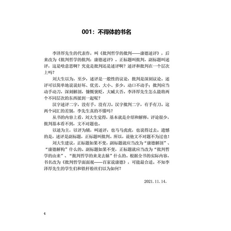 刘大生以为,至少,述评是一般性的议论,批判是深刻议论。述评可以简单地说说好坏、优劣、大小、多少,动口不动手;批判应当动手动刀,深刻解剖,慷慨褒贬,大臧大否。李泽厚先生怎么能将两个不同层次的东西揉到一起呢? 汉字述评二字,没有手,没有刀。汉字批判二字,有手有刀。这两个词汇的差别,李先生真的不懂吗? 从书的内容上看,刘大生觉得,基本就是介绍和解释,评论很少,批判基本看不到,文不对题也。 以述为主,以评为辅,叫述评,也马马虎虎,也说得过去。遗憾的是,述评是副标题,正标题叫批判。所以,说他文不对题不为过也! 刘大生建议,正标题如果不变,副标题就应当改为“康德解剖”、“康德解构”什么的。副标题如果不变,正标题就应当改为“批判哲学的由来”、“批判哲学的来龙去脉”什么的。根据全书的实际内容,书名改为《批判哲学面面观——百家说康德》,可能最合适。不知李泽厚先生的学生们和铁杆粉丝们以为如何?