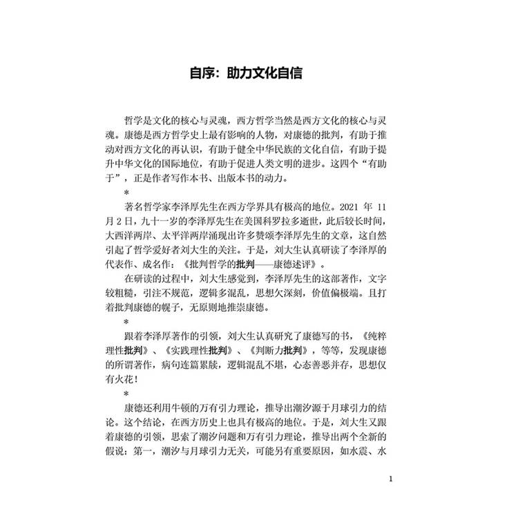 哲学是文化的核心与灵魂,西方哲学当然是西方文化的核心与灵魂。康德是西方哲学史上最有影响的人物,对康德的批判,有助于推动对西方文化的再认识,有助于健全中华民族的文化自信,有助于提升中华文化的国际地位,有助于促进人类文明的进步。这四个“有助于”,正是作者写作本书、出版本书的动力。 * 著名哲学家李泽厚先生在西方学界具有极高的地位。2021年11月2日,九十一岁的李泽厚先生在美国科罗拉多逝世,此后较长时间,大西洋两岸、太平洋两岸涌现出许多赞颂李泽厚先生的文章,这自然引起了哲学爱好者刘大生的关注。于是,刘大生认真研读了李泽厚的代表作、成名作:《批判哲学的批判——康德述评》。 在研读的过程中,刘大生感觉到,李泽厚先生的这部著作,文字较粗糙,引注不规范,逻辑多混乱,思想欠深刻,价值偏极端。且打着批判康德的幌子,无原则地推崇康德。