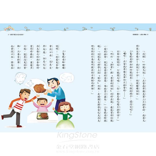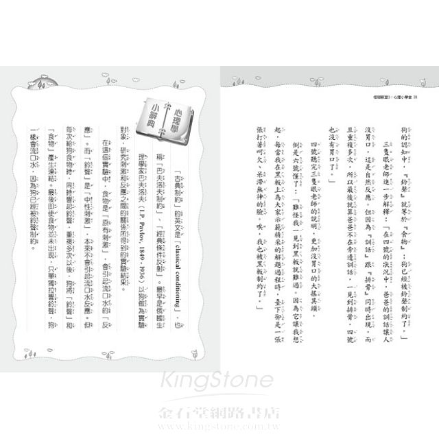 跟小朋友息息相關的就是學習了!在心理學上也有許多著名的心理學故事,像是本書第一篇〈古典制約──你是不是巴夫洛夫的狗?〉就跟學習有密切關係。如果學習過程是愉快而有趣的,就會產生一種心理連結,所以爸爸媽媽千萬不要一天到晚用叨叨念念的方式叫孩子學習,一旦讓孩子心生反感,反而會討厭學習。又如第七篇《比馬龍效應──獎勵是有用的》中,「比馬龍效應」是指如果老師認定某些學生為「資優生」,即使他們並非真正的資優,但是經過老師的提點和鼓勵,最終亦會自自然然的成為資優學生。這個理論在教育界主要應用在教學上有關如何善用教材及教學法方面,以啟發學生的自尊心。「比馬龍效應」與「自我實現的預言」類似,預言可以是壞事,也可以是好事。最重要的是,如果一個人得到適當的鼓勵和認同,平庸的人也可以有突出的成就。但如果一開始就認定自己會失敗,通常結果就真的會失敗。因此,爸媽或老師可以好好幫助孩子訂定目標,適時的給予鼓勵或協助,讓孩子朝向正向的方面發展!