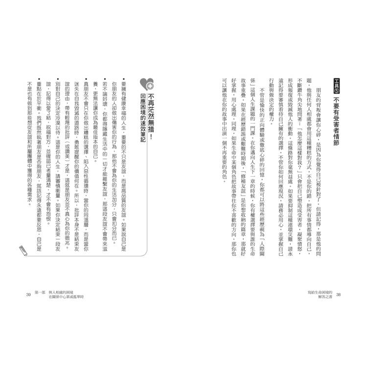 在痛苦又困惑的時刻,多數人都沒有辦法對自己說出自己最需要聽的話,這不是我們哪裡有問題,純粹只是因為每一個人都在邊活邊學。所以, 這是一本給我們所有人的書,適合給離巢孩子讀、給相隔千里的朋友讀、給不知道對他說什麼比較好的家人讀、給需要找尋出路的我們自己讀。