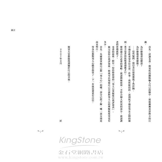 本書正是為了無法理解那樣的男人心而吃虧的女性,將複雜的男人心做簡單易懂的說明,從男性觀點出發的專為女生設計的戀愛指南。