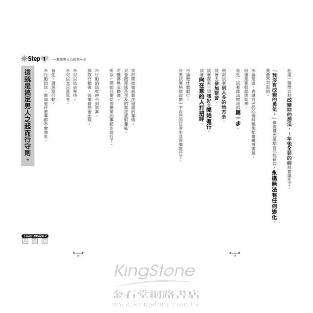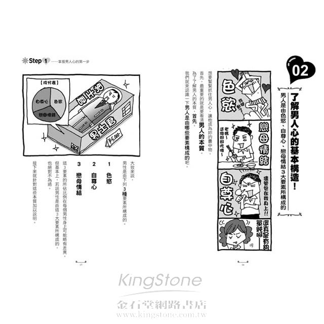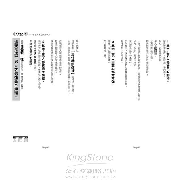 ●共分6大章、50招,讓妳循序漸進地認識男性,再慢慢學習運用攻略、直至功力爐火純青。