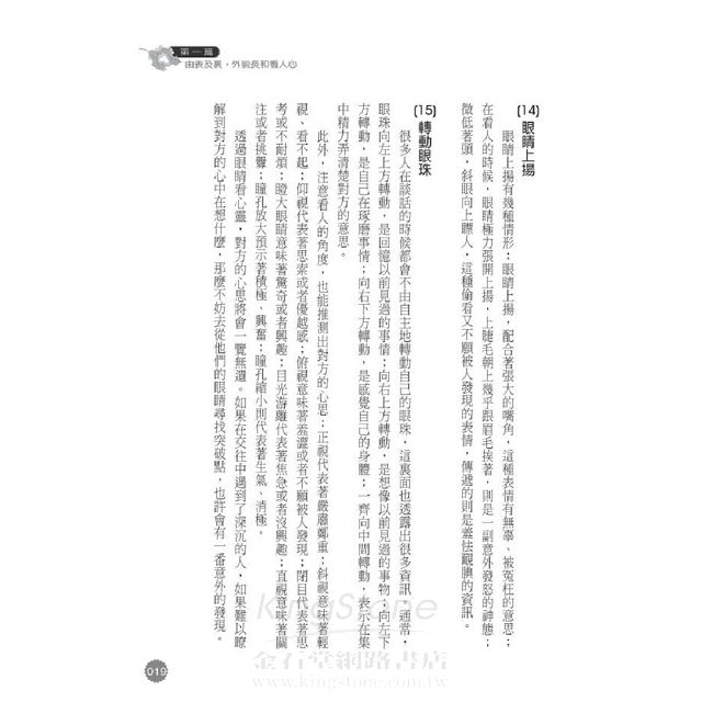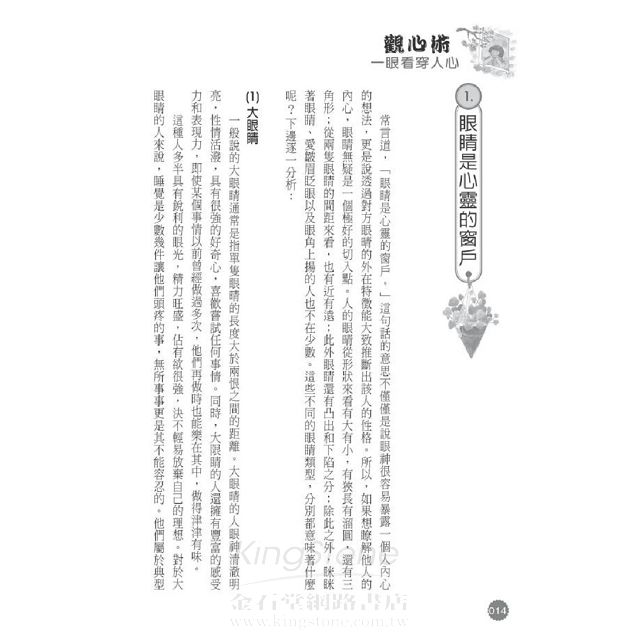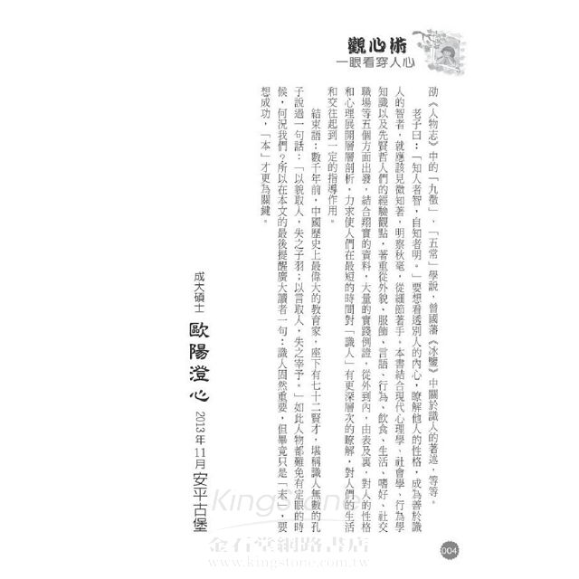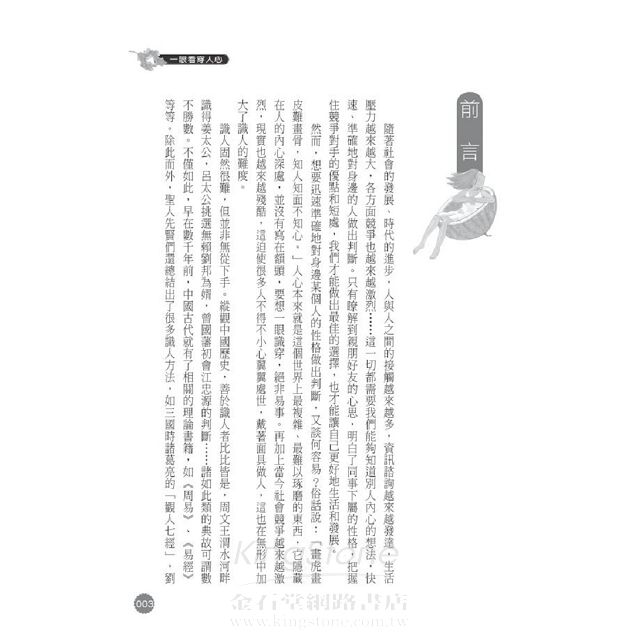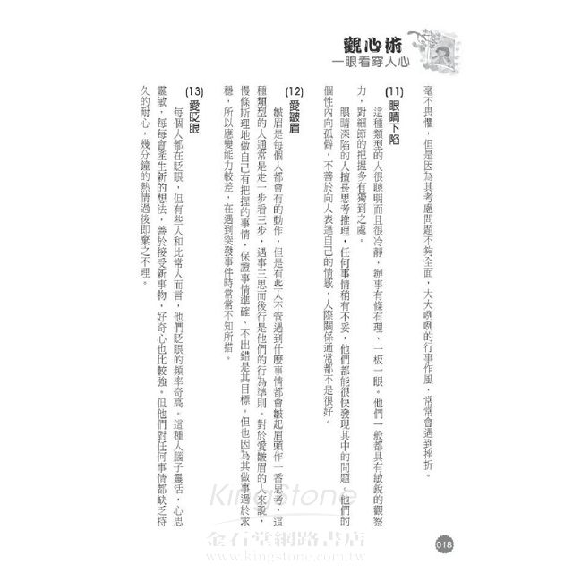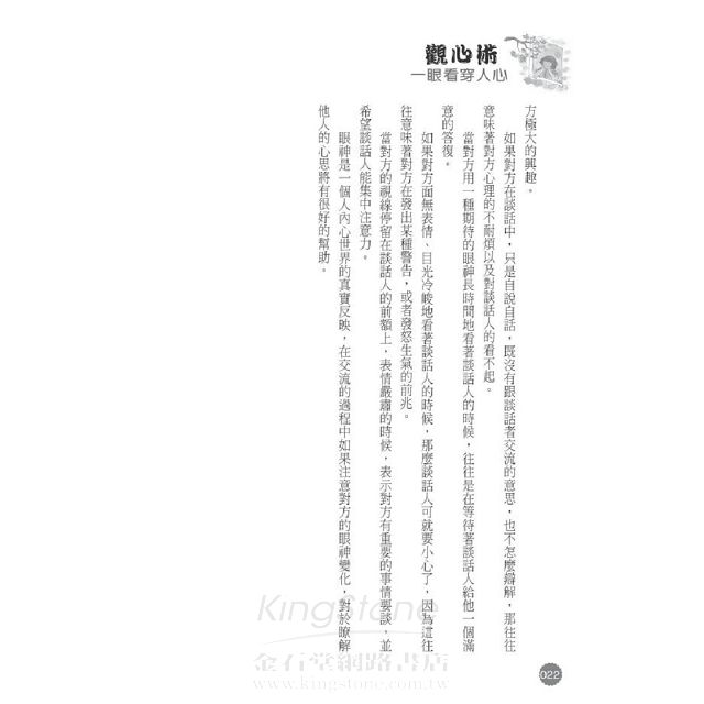 老子曰:「知人者智、自知者明」。要想善於觀其人、知其性,就要先學會“明察秋毫、見微知著”;本書結合現代心理學、行為舉止學,以及先聖先賢的經驗法則,結合大量的前例實證,千錘百鍊此一“觀心術”一眼看穿人心。