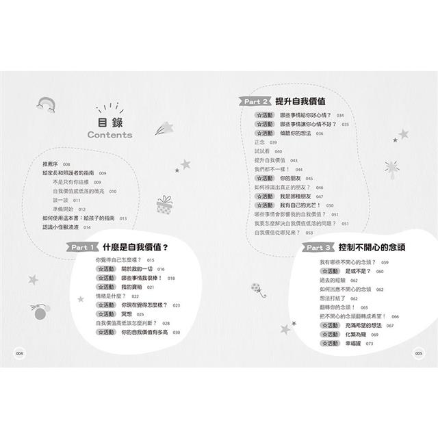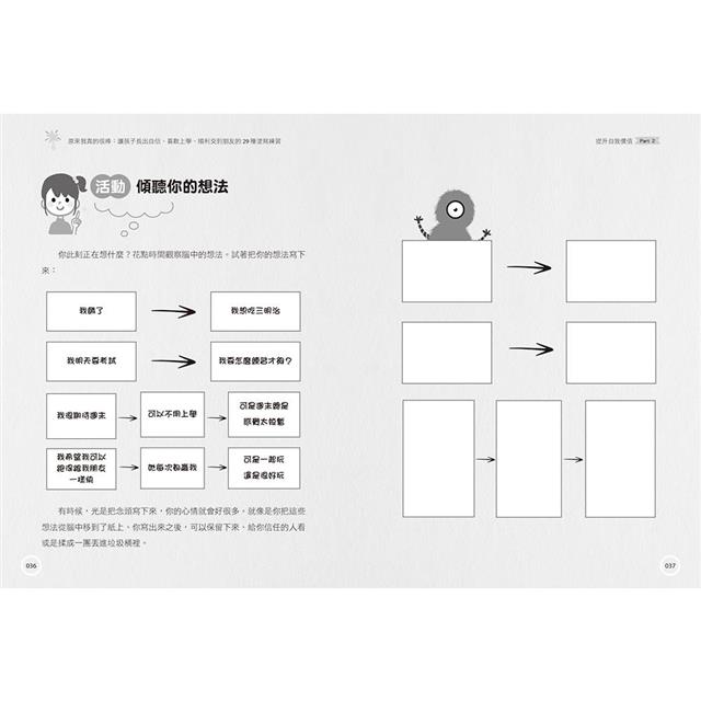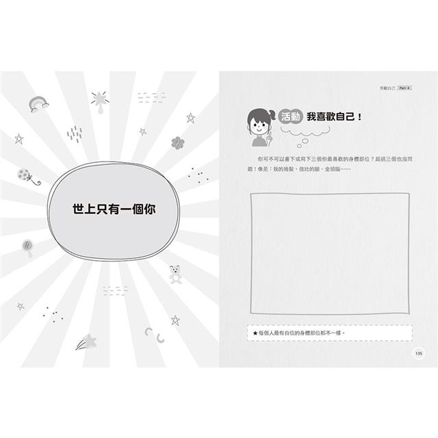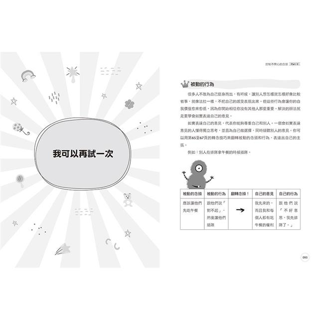 ★學會「轉換不開心的念頭」:把腦中負面、消極的想法,翻轉成正向、積極的念頭,從「我做不到」變成「原來我很棒」。只要改變想法,就能改變對自己的看法,輕鬆長出自信!