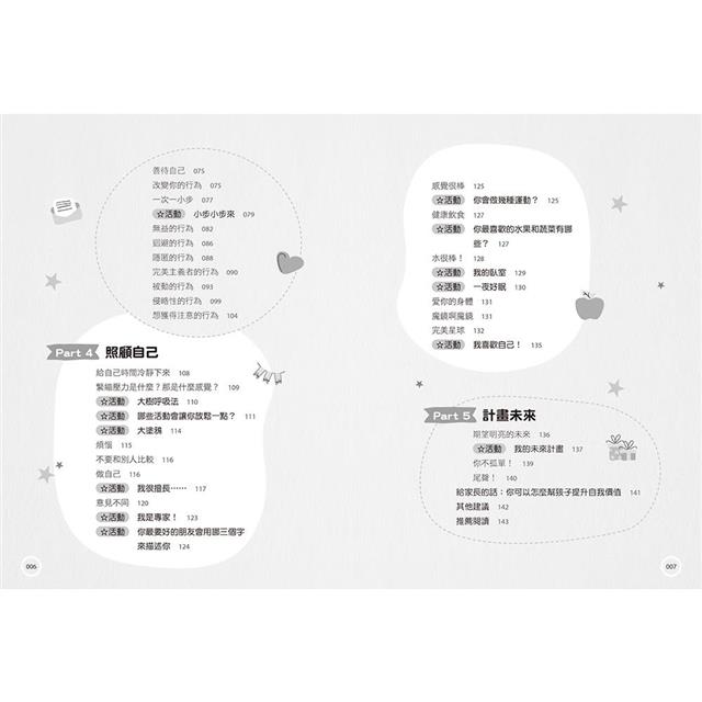 ★瞭解「照顧自己」的重要性:學會讓身體放鬆、確保自己睡得安穩、吃得健康,好好照顧自己,這將能夠在孩子心中種下「愛自己」的種子,讓他們更喜歡自己,更懂得疼愛自己。