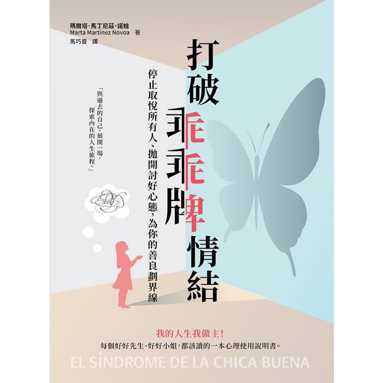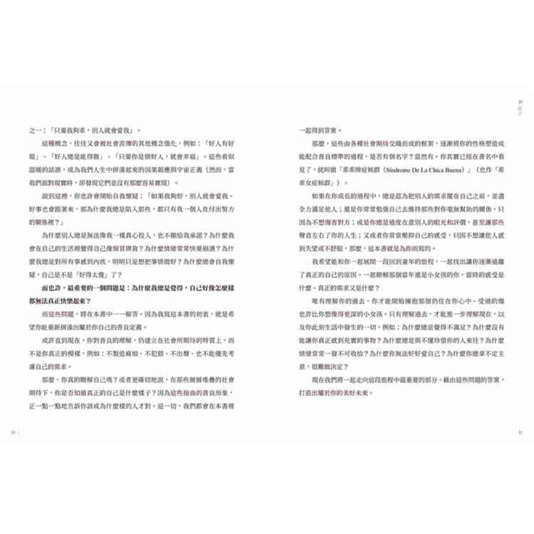 那麼,這些由各種社會期待交織而成的框架,逐漸將你的性格塑造成能配合善良標準的過程,是否有個名字?當然有。你其實已經在書名中看見了,就叫做「乖乖牌症候群(Síndrome De La Chica Buena)」(也作「乖乖女症候群」)。如果在你成長的過程中,總是認為把別人的需求擺在自己之前,並盡全力滿足他人;還是你常常勉強自己去維持那些對你毫無幫助的關係,只因為不想傷害對方;或是你總是過度在意別人的眼光和評價,甚至讓那些聲音左右了你的人生;又或者你常常壓抑自己的感受,只因不想讓他人感到失望或不舒服,那麼,這本書就是為你而寫的。我希望能和你一起展開一段回到童年的旅程,一起找出讓你逐漸遠離了真正的自己的原因。一起瞭解那個當年還是小女孩的你,當時的感受是什麼、真正的需求又是什麼?唯有理解你的過去,你才能開始擁抱那個仍住在你心中、受過的傷也許比你想像得更深的小女孩。只有理解過去,才能進一步理解現在,以及你此刻生活中發生的一切,例如:為什麼總是覺得不滿足?為什麼沒有能讓你真正感到充實的事物?為什麼總是與不懂珍惜你的人來往?為什麼情緒常常一發不可收拾?為什麼你無法好好愛自己?為什麼你總拿不定主意,很難做決定?現在我們將一起走向這段旅程中最重要的部分。藉由這些問題的答案,打造出屬於你的美好未來。學會真正認識自己、照顧自己;學會設下界線,清楚地分辨出你想要 擁的人際關係;學會不再讓別人的看法來主導你的人生方向;學會對自己有信心,相信自己做的每一件事。找出那些深藏在潛意識的情緒,學會如何面對與處理它們。