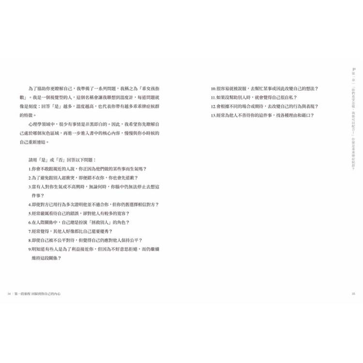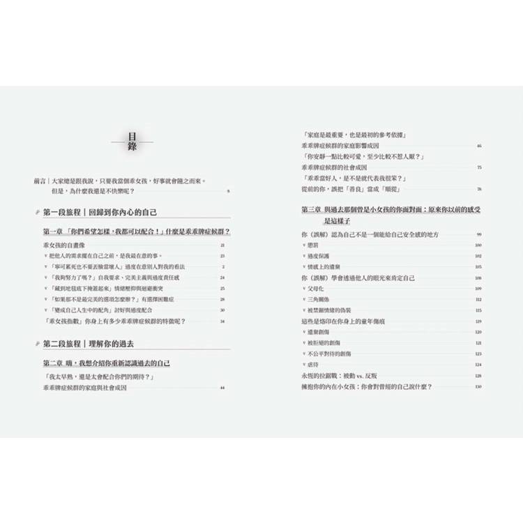 回想一下從前的你,一定也曾經是個心中滿懷夢想和希望,總想去玩,想到處探索的小女孩。你是否記得,有人跟你說過「以這年紀來說,你真的很成熟。」或者稱讚你:「你的思緒清晰又有條理。」還是有人說你是個很乖的小女孩,因為你總是聽話,從不抱怨。「哇,瑪莉,你女兒好乖喔!都安安靜靜的,不會吵鬧或打擾別人。」你是否聽過類似的話?我想,這些回憶會讓你心中湧上一股自豪、溫暖和開心的情緒。那時,我們愛著、重視的大人們,總陪在我們身邊、教我們認識這個世界、瞭解自己是誰。他們甚至還會告訴我們,應該成為怎麼樣的人。當那些我們依賴、仰慕的大人同樣愛著我們、肯定我們時,我們所感受到的,是那分快樂與幸福。我想你現在可能很疑惑,這些事到底有什麼大不了的?當個乖孩子有什麼不好?還有,為什麼我決定要寫關於這件事的書?你或許會覺得我是不是瘋了,怎會把你形容得像是做錯事?先說結論:並沒有。