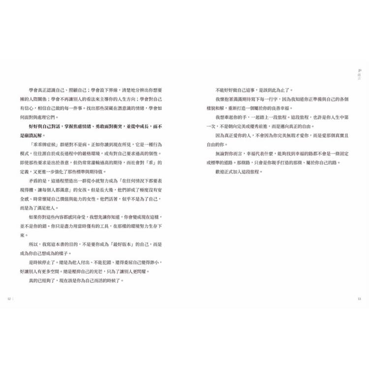 真的已經夠了,現在該是你為自己而活的時候了。不能好好做自己這件事,是該到此為止了。我懷抱著滿滿期待寫下每一行字,因為我知道你正準備與自己的各個樣貌和解,重新打造一個屬於你的良善幸福。我想牽起你的手,一起踏上一段旅程。這段旅程,也許是你人生中第一次,不是朝向完美或優秀前進,而是邁向真正的自由。因為真正愛你的人,不會因為你完美無瑕才愛你,而是愛那個真實且自由的你。無論對你而言,幸福代表什麼,幸福的路都不會是一條固定或標準的道路。那條路,只會是你親手打造的那條、屬於你自己的路。