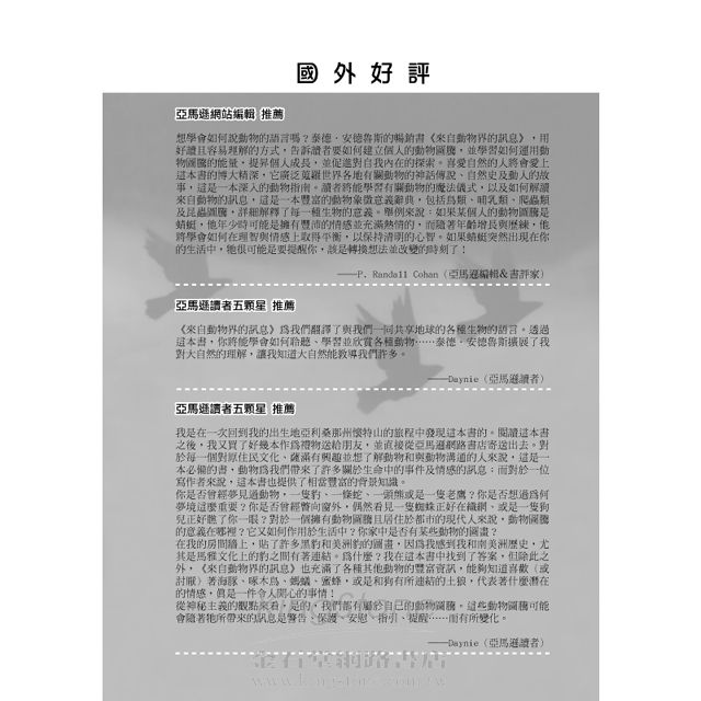 如果你喜歡與動物王國為伍,或是你想要試著建立這些神奇的連結,那麼不要猶豫,把這本書加入你的收藏中吧!」