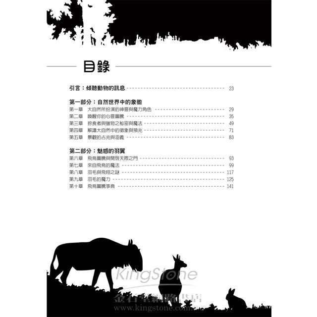 《來自動物界的訊息》提供了許多技巧,教我們如何辨認並解釋大自然的象徵和徵象。學會牠們的肢體行為語言,你將能找到屬於自己的動物圖騰與動物精靈。這本書收錄超過100種動物,包含哺乳類、鳥類、昆蟲、爬蟲類等等,將幫助你: