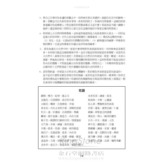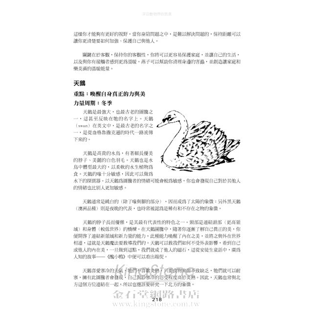 身:這本書,非常的大地、非常的向下紮根;它紮紮實實的教導我們每一種動物(書中涵蓋了近一百多種動物)的語言及象徵圖騰,包括和土地的連結,和自然元素地水火風的交融;書中藉由動物的習性、特徵、顏色、食物鏈中和上層及下層的關連(生態平衡中的角色)、聲音、社會型態、特