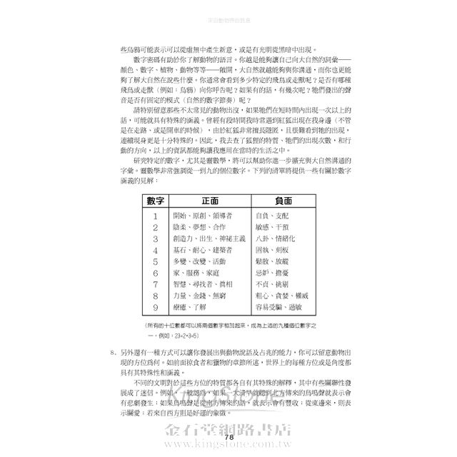 「想學會如何說動物的語言嗎?泰德.安德魯斯的暢銷書《來自動物界的訊息》,用好讀且容易理解的方式,告訴讀者要如何建立個人的動物圖騰,並學習如何運用動物圖騰的能量,提昇個人成長,並促進對自我內在的探索。喜愛自然的人將會愛上這本書的博大精深,它廣泛蒐羅世界各地有關動物的神話傳說、自然史及動人的故事,這是一本深入的動物指南。讀者將能學習有關動物的魔法儀式,以及如何解讀來自動物的訊息,這是一本豐富的動物象徵意義辭典,包括鳥類、哺乳類、爬蟲類及昆蟲圖騰,詳細解釋了每一種生物的意義。舉例來說:如果某個人的動物圖騰是蜻蜓,他年少時可能是擁有豐沛的情感並充滿熱情的,而隨著年齡增長與歷練,他將學會如何在理智與情感上取得平衡,以保持清明的心智。如果蜻蜓突然出現在你的生活中,牠很可能是要提醒你,該是轉換想法並改變的時刻了!」