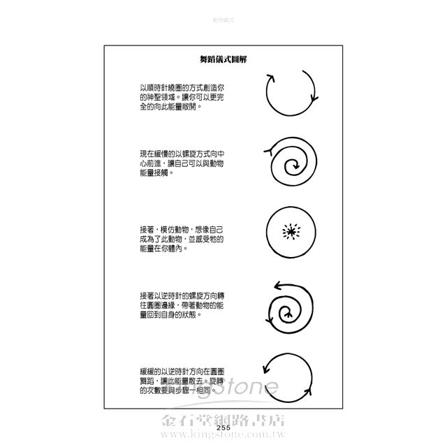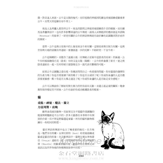 雖然這本書非常善於深刻探討個別的動物,但它不僅僅是一本事典。安德魯斯還撰寫了相當多的篇幅,教你如何與動物的能量更加親近。我非常享受這些教導動物占卜儀式的章節,這些儀式能讓我們發展更深廣的自覺意識,促進我們跟自然界萬物的關係,展現了我們在本質上,是如何與這張生命的網絡互相連結在一起。