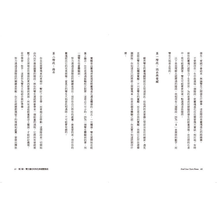 每一段雙生火焰關係都有許多階段、發展、覺醒、上升、下降、橫向整理,所有這一切都是奠基於你的靈魂為了進化需要學習的內容。關於雙生火焰,要理解的最重要事情是,在上帝的整體創造中,只有另一個靈魂有可能是雙生火焰。你可能會聽見這個概念不僅稱為「雙生火焰」,又叫做「雙生靈魂」(twin souls)、「雙生光」(twin rays)或「另一半」(other half)。這些都是一樣的,意指你的靈魂的另一半。還有另一個概念與雙生火焰密切契合,它是關於靈魂伴侶(soul mate)。