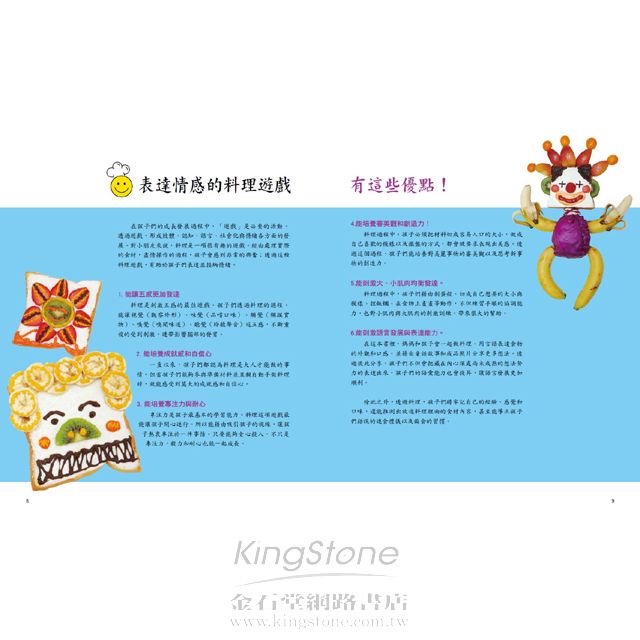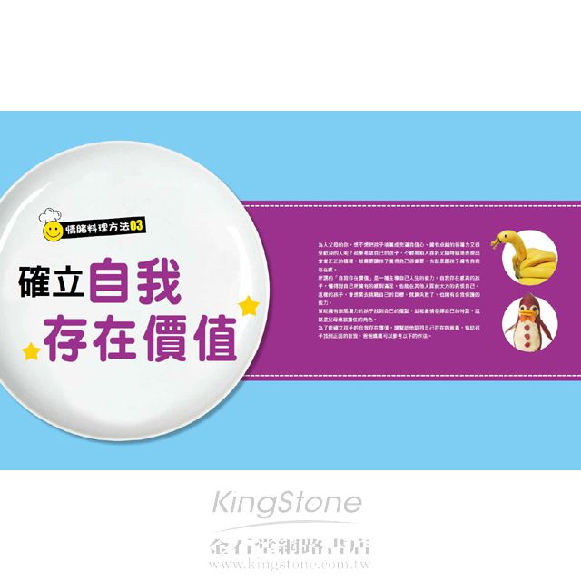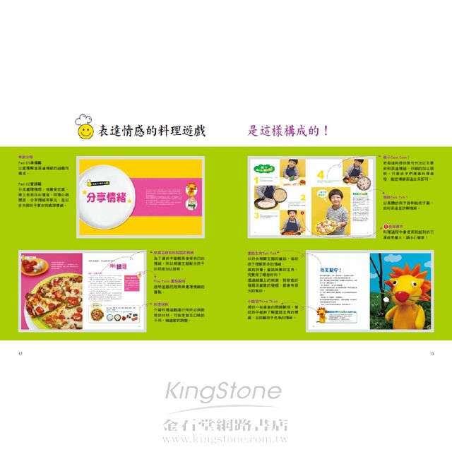 《表達情感的COOK遊戲》跳脫說教的口吻、理論的框架,充滿創意的將料理與情緒表達串連在一起。原來,從食材的外觀、口感、味道,可以如此巧妙的和孩子的感官(視覺、聽覺、觸覺、嗅覺、味覺)相互結合,並且從中提供成人和孩子一個認識自己情緒的媒介。有情緒,不是壞事,如何適切的表達與控制情緒才是一門學問。透過書中的料理遊戲,從食材的挑選開始,孩子就開啟了「情緒」的抽屜,隨著料理的步驟,孩子一步一步的整理自己的情緒盒,而大人在輕鬆平和的狀態下,更能夠傾聽孩子的聲音。隨著料理的完成,孩子似乎也完成了一趟「情緒修復之旅」,同時還能享受「美味料理」。最後,大人和孩子的心,也都「幸福」了起來。在料理過程中,有親子的互動,孩子有大小肌肉的協調操作與語言的刺激;有了情感的交流,孩子的情緒自然平穩,還有什麼比這更神奇的呢!--王湘妤(菲力文教機構 禾力托兒所所長)