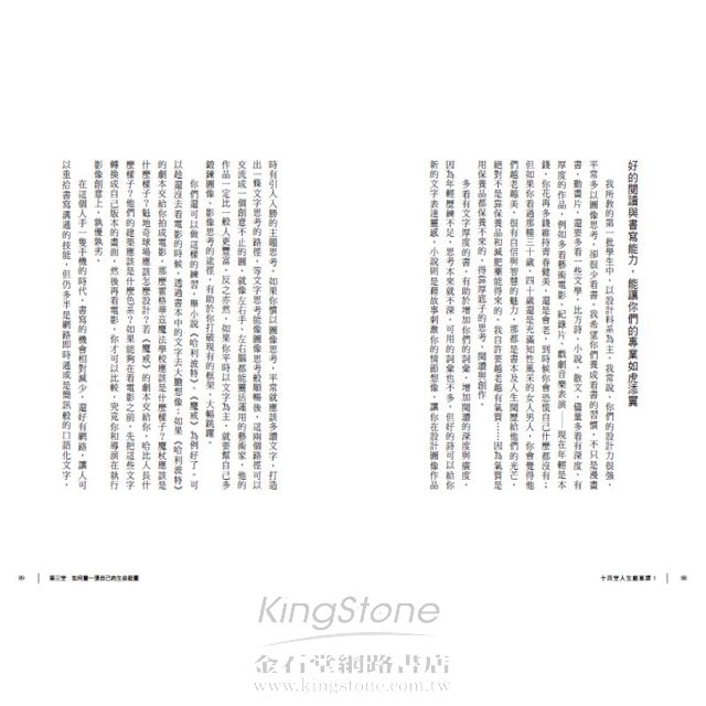 這其中包含兩大要素:一是不斷地吸納經典與新知,這包括持續大量的閱讀、旅行與觀賞電影等。讓自己長出觸角與世界相連,建立自己與世界相連的資料庫與情報系統。另外一部分則是如何把吸納的知識內化為生命的智慧,打造自己獨特的生命風格,一種別人替代不了的創意泉源。這是屬於生命視野的轉化與騰躍,需要心靈的修煉、想像力的翱翔,與專注持恆的實踐力。用書中的話來說就是:「知識是船帆,智慧是船底,要維持協調的比例,否則會翻船。」