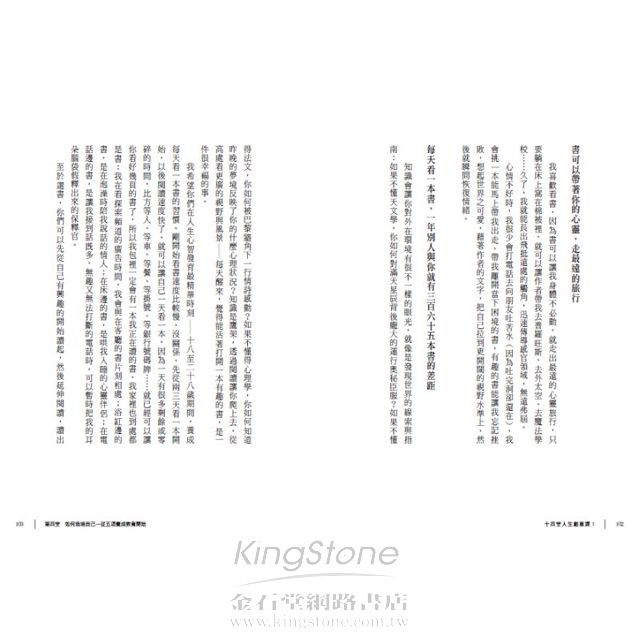 此外,我讀到作者對學生真摯誠懇的關愛,書中殷殷叮嚀學子們,要專心做自己和自己競賽,不要預設假想的敵人,因為我們畢竟當不成別人,只能完成自己。因此要相信自己能為這個世界帶來獨特的生命驚喜。這才是為自己擺設的生命宴席啊!
