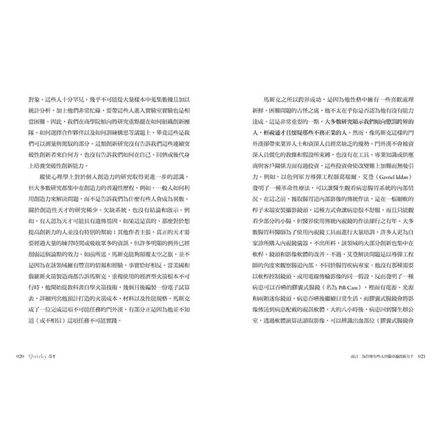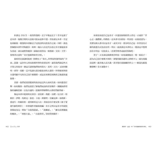 「透過這本書,我們得以窺見奇才們讓『偶然』成為『必然』的特質與機制,從而反思自我成長與釋放創新潛能的可能性。我們未必能像這些奇才一樣,擁有改變這個世界的能力,卻可以從書中獲得改變自己世界的啟發與建議。此外,這本書結合了科學研究的視角與傳記陳述的方式,同樣令人深深著迷。」──職人簡報與商業思維專家 劉奕酉