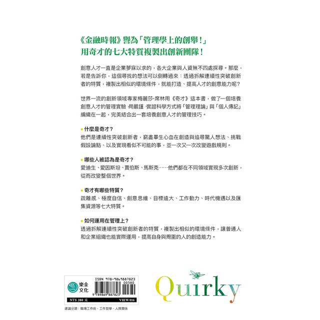 「《奇才》提醒我們要理解非凡人物時,異數和另類份子都是寶貴的導師。他們能夠打破社會期望、有信心解決看似棘手問題以及擁有社交技巧激勵他人,確實不同於常人。席林的書帶我們踏上一段鼓舞人心的探索之旅,引領我們清楚看到那些隱藏於平凡中的不凡。讀完本書會對真正的天才有另一番理解。」──莉塔‧麥奎斯(Rita McGrath),哥倫比亞大學。