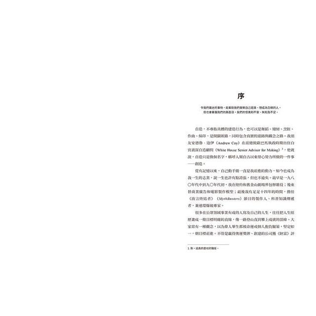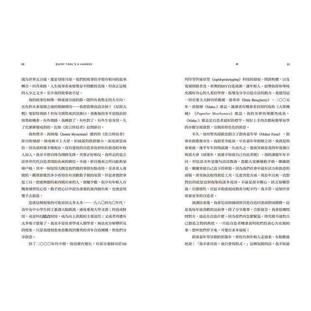 這本書是我創客生涯的紀錄。除了探索自造和我自身的創作狂熱,也像是我發給你的同意書,允許你去把握引起你興趣、令你著迷的事物,縱身躍入其中,看看會帶你走向哪裡。