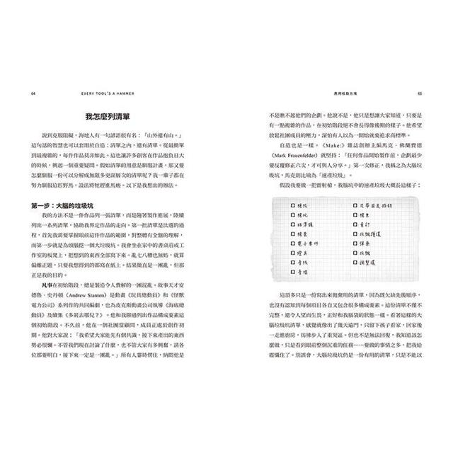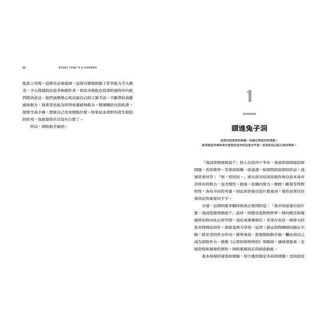 藉由我這四十多年來從事自造、鑄造、建造、破壞所累積的故事,以及一路學到的教訓,我希望這本書像是解決問題的工具箱,附帶經營一間工作室所攢下的筆記,說明我最常用的工具、技術或方法。例如:每件工具都能是「槌子」──別等到萬事皆備才動工,假如沒有眼前任務需要的適當工具,手邊有什麼就用什麼。提高鬆配公差──自造免不了一團混亂,時時刻刻都會搞砸,但是不要緊,因為創意本來就是一條迂迴曲折的路,沒有直線捷徑可走。多用冷卻液──冷卻液能延長刀刃和鑽頭的壽命,預防工具失靈,但除此之外,也能提醒自己放慢速度,減少作業上和關係中的摩擦。螺釘勝過黏膠──機械式接合允許你更動修改作品,而黏膠一黏住就是永遠,但有時候你只是需要用對黏膠,所以我會深入說明哪一種黏膠適用,且效果最好、傷害最小。