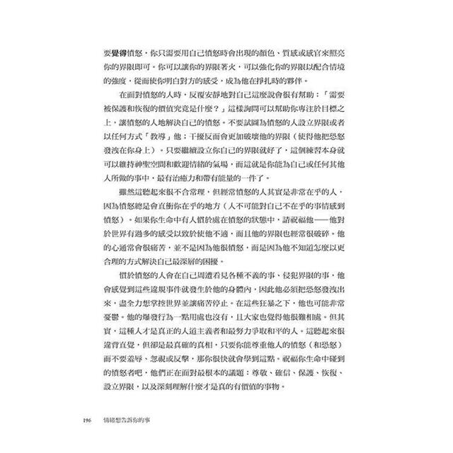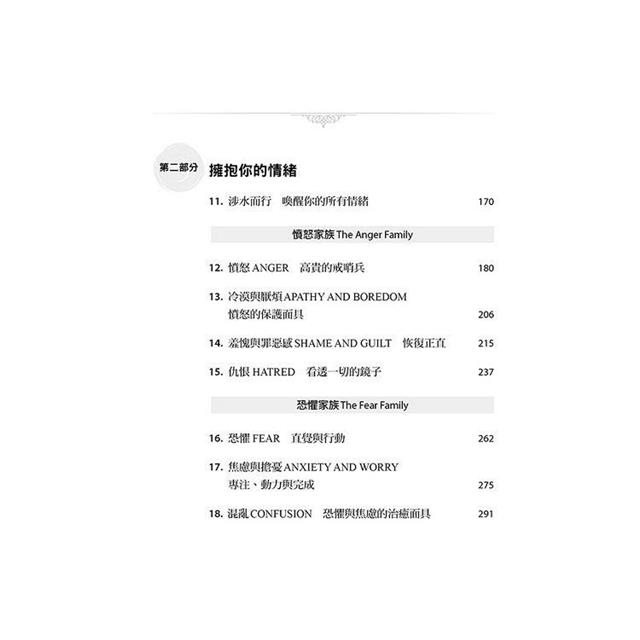 本書完整涵蓋了4大類、18種不同的情緒,包含憤怒、喜悅、恐懼、滿足、羞恥、嫉妒、哀傷等廣泛的範圍。書中還有大量的練習,幫助我們透過身體的反應,理解自己此刻面對的是什麼情緒,如何將它適當的引導。