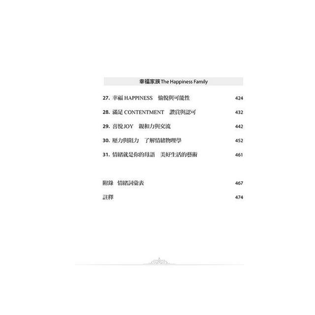 書末附有情緒詞彙表,將每一種情緒在不同強度之下(輕微的、中等的、強烈的)的表現,以及會產生的感覺,都詳細列出。可以幫助我們在日常生活中,檢視自己與他人當下的情緒類別、強度及感覺。