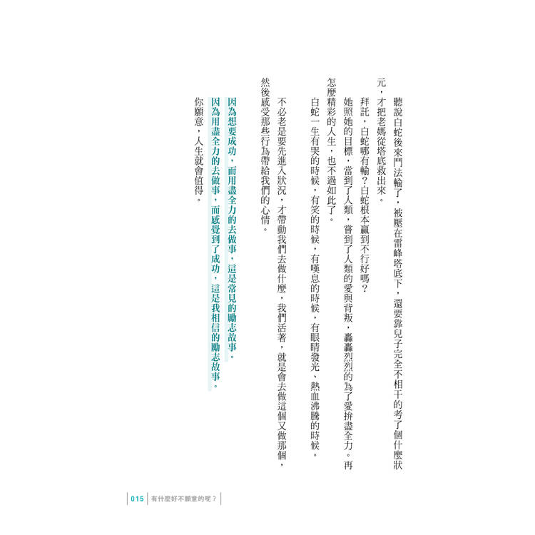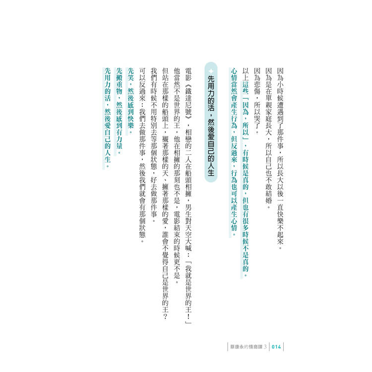 這本《你願意,人生就會值得》,則談情商要像水滴般的累積,而不是一躍過龍門。那些一步登天的美麗傳說,確實會發生在某些人身上,但通常那樣的故事,背後總是藏了不少其他的原因,只是被講得像一步登天而已。