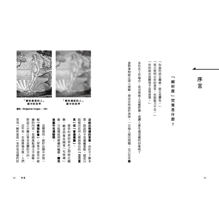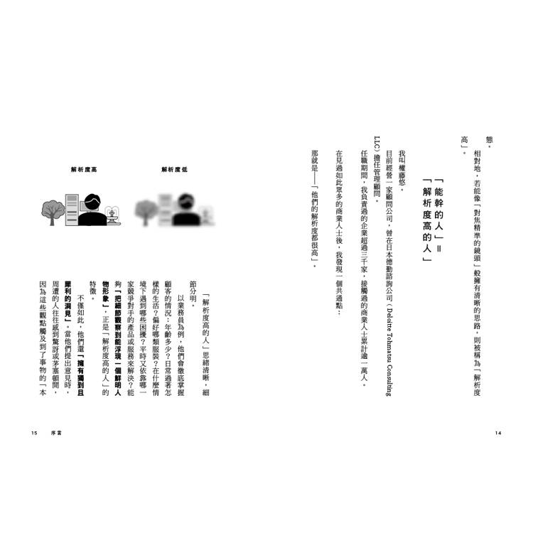 所謂「解析度高」,指的是如高畫質圖像般清楚的思緒,腦中如同勾勒出一幅具體畫面,思考具有結構、觀點明確。相對地,「解析度低」則是思緒模糊、方向不明,看不清當下的狀況,也看不清未來的目標。