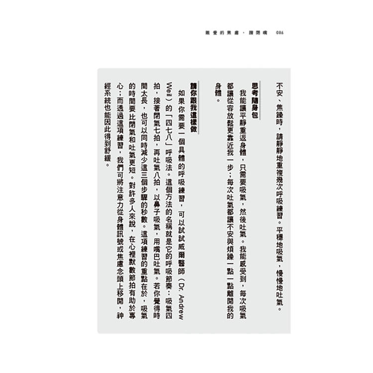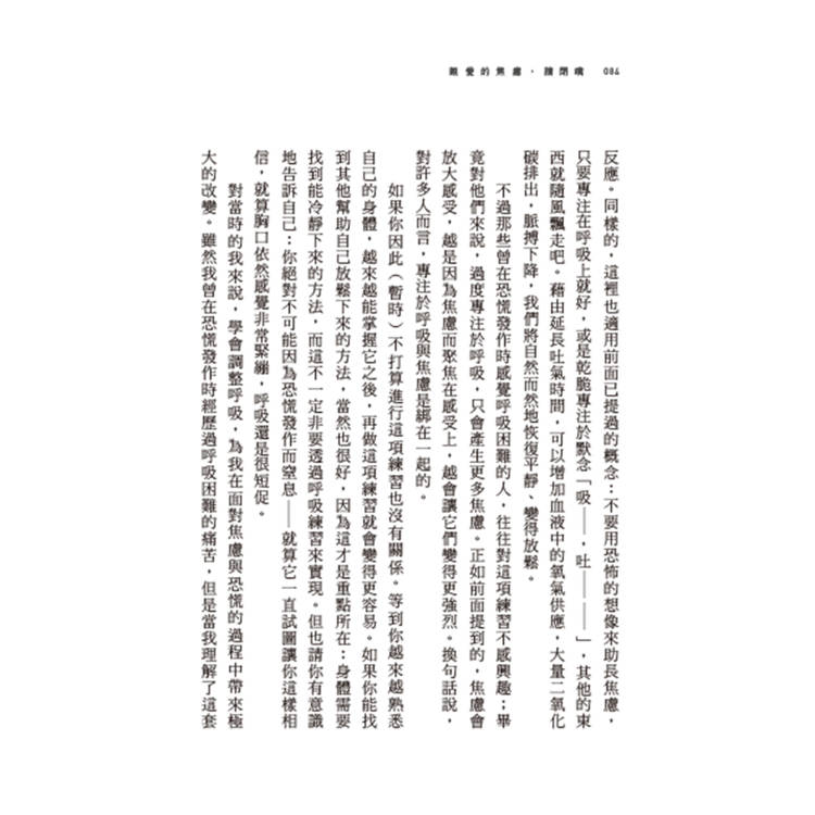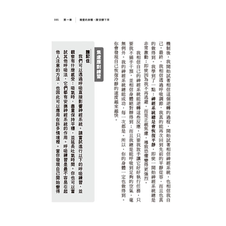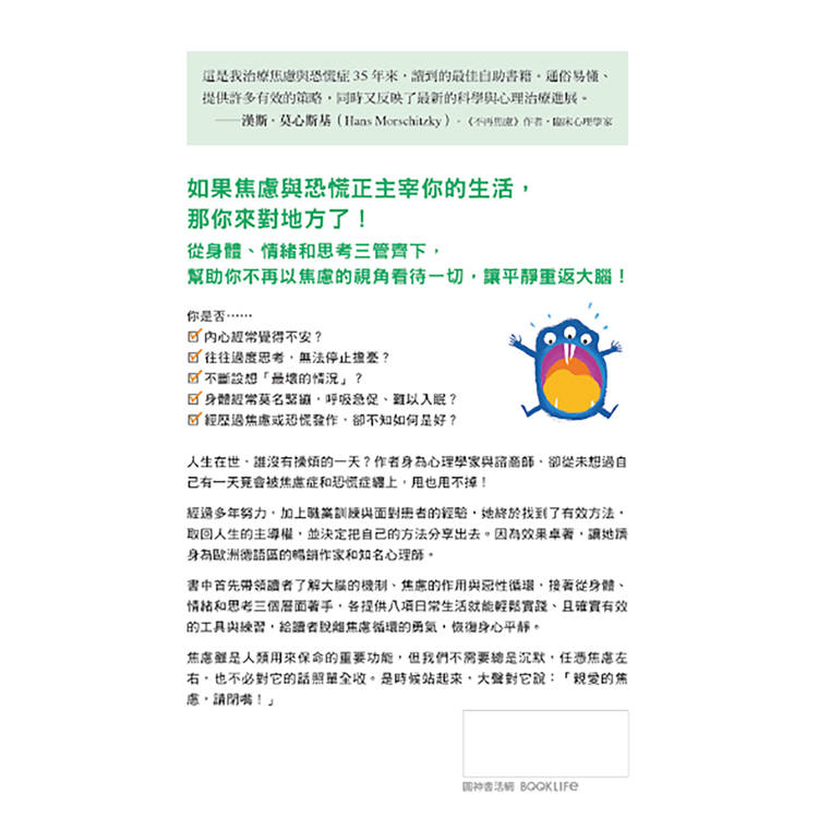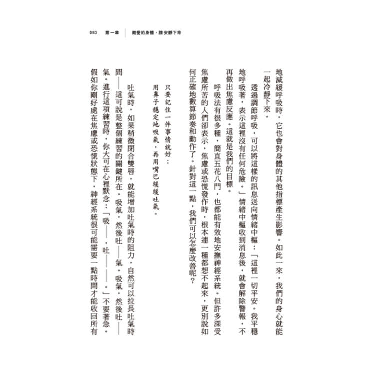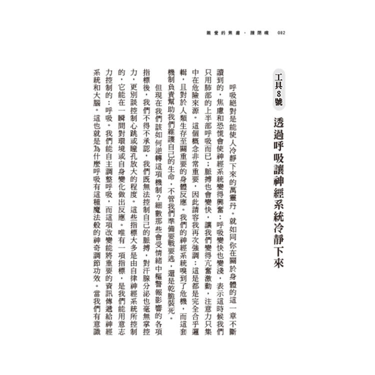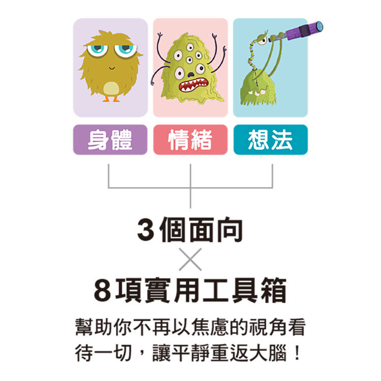 書中首先帶領讀者了解大腦的機制、焦慮的作用與惡性循環,接著從身體、情緒和思考三個層面著手,各提供八項日常生活就能輕鬆實踐、且確實有效的工具與練習,給讀者脫離焦慮循環的勇氣,恢復身心平靜。
