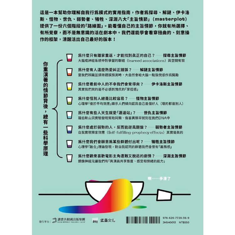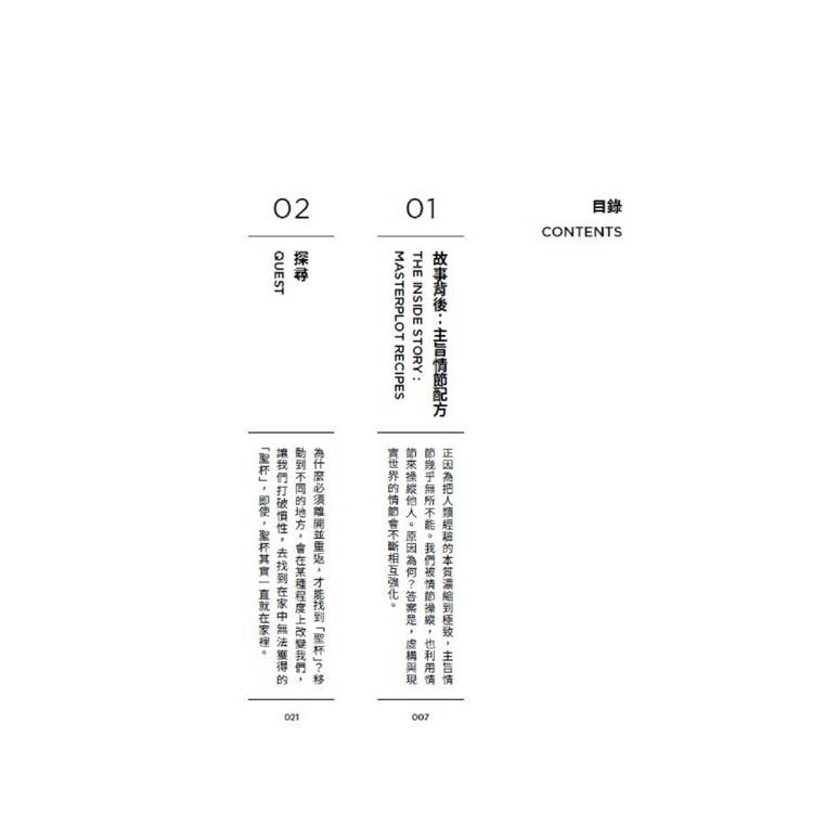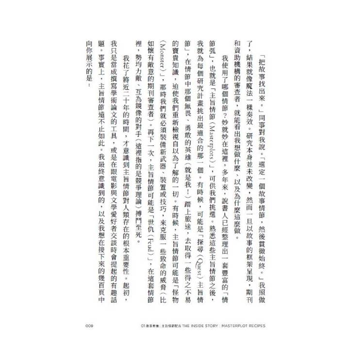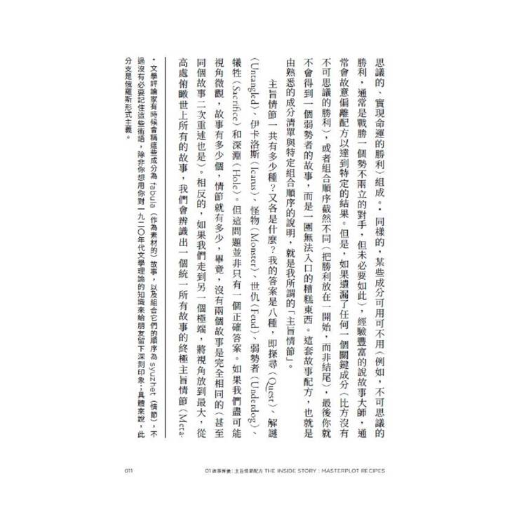 這是一本幫助你理解自我行為模式的實用指南,作者為探尋、解謎、伊卡洛斯、怪物、世仇、弱勢者、犧牲、深淵八大「主旨情節」(masterplot)提供了一份六個階段的「路線圖」。順著路線前進,我們可以深入了解每個主旨情節的構成、在虛構世界與現實生活中如何應用、背後的心理學原理,以及情節是如何被使用或濫用的。