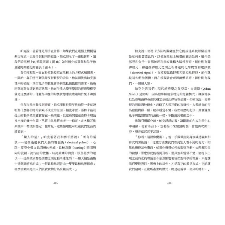 複雜則在社會中俯拾皆是。跨越全球的貨物和服務運送、文明的興衰、政府和大型跨國組織的結構,都充滿了複雜性。複雜也在日常生活中,在與親友的關係裡,我們可能同時感受到愛與挫折。複雜也存在於我們體內,是數十億個大腦神經元的發送,也是你的人生故事,訴說著你是如何走到今天。