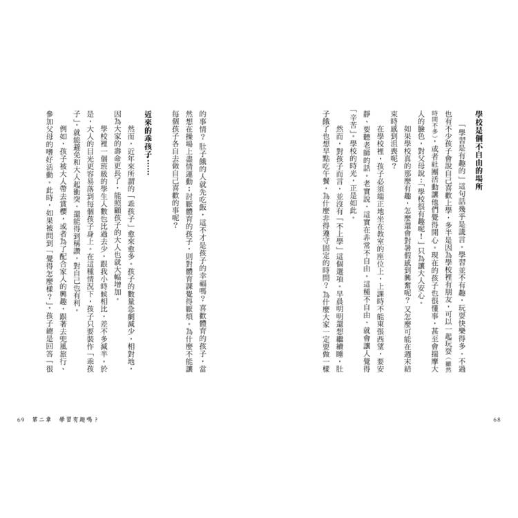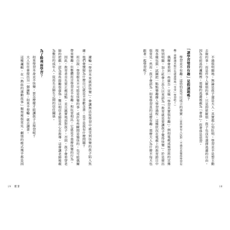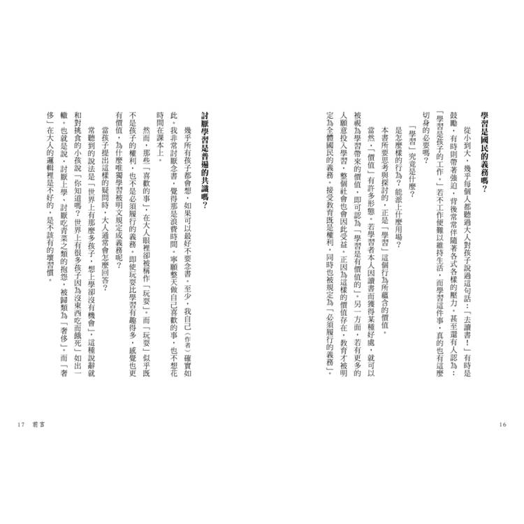 本書不是寫給孩子看的,也不是為了那些想逼孩子去念書的父母。如果真想讓孩子願意學習,最好的方法就是父母自己先去學習。當孩子看到父母全神貫注於學習的模樣,自然會感受到「學習好像是什麼有趣的事情呢」。我認為,教育的本質應該就是如此。