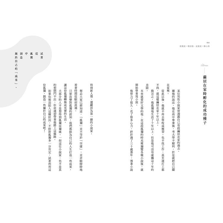 「孤獨」是心境上可以從容自處的空間。是自由,也是起點與無所羈絆。心境自由了,才會是治癒的開始。