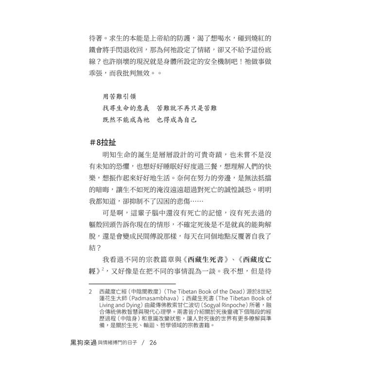 孟子曰:「天將降大人於是人也,必先苦其心志,勞其筋骨,餓其體膚,空乏其身,行拂亂其所為,所以動心忍性,曾益其所不能。」每當黑狗纏著要人陪時,我就會取這段話來勉勵自己,告訴自己這是磨練的道路,如同蝦子脫殼才會再度長大。儘管每次都耗盡心神,痛苦過後會進化更好的模樣,而我不過是正在脫殼的途中,每一次都是經驗,順應流動,不去想──要或不要。