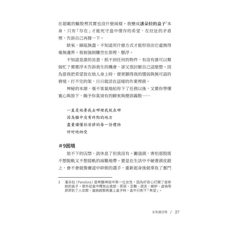 放不下的囚禁,該休息了但我沒有。撇過頭,害怕那股既不想脫軌又不想接軌的兩難地帶。要是在生活中不硬著頭皮跟上,會不會就像賽道中絆倒的選手,重新起身後就辜負了奮鬥至今的曾經?在向前或是停止的取捨之間,交織著一言難盡的頭破血流。
