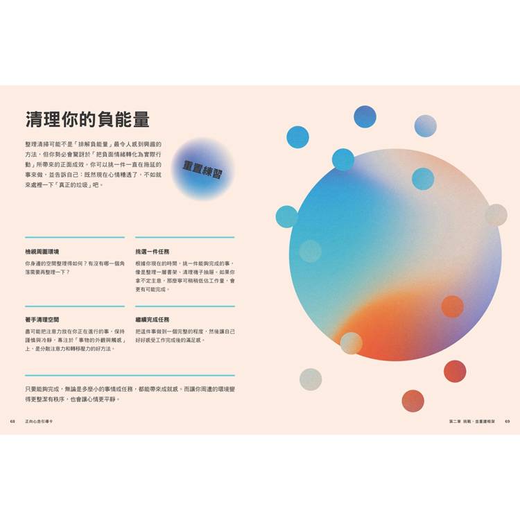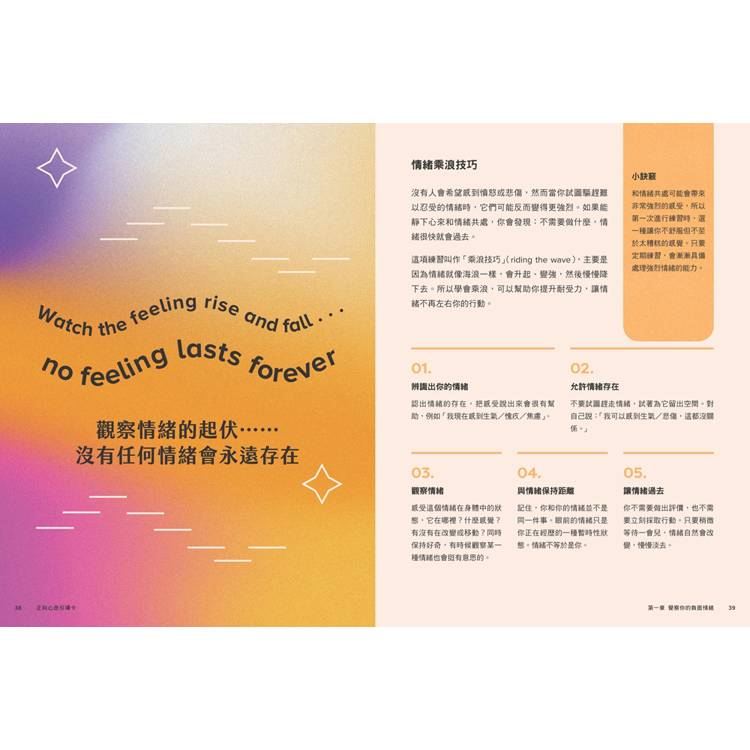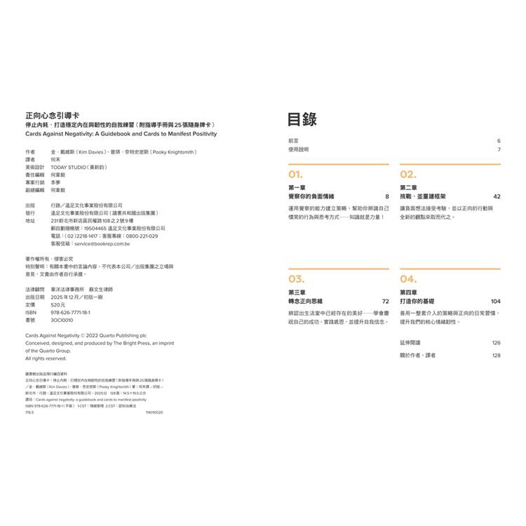 內容共分為四章,作者根據不同的階段而規劃出練習步驟,你可以照著作者安排的順序來調整自己的情緒能量修復進度,也可以根據自己當下的情緒與狀態,挑選最適合自己的練習技巧,甚至是隨機挑選。