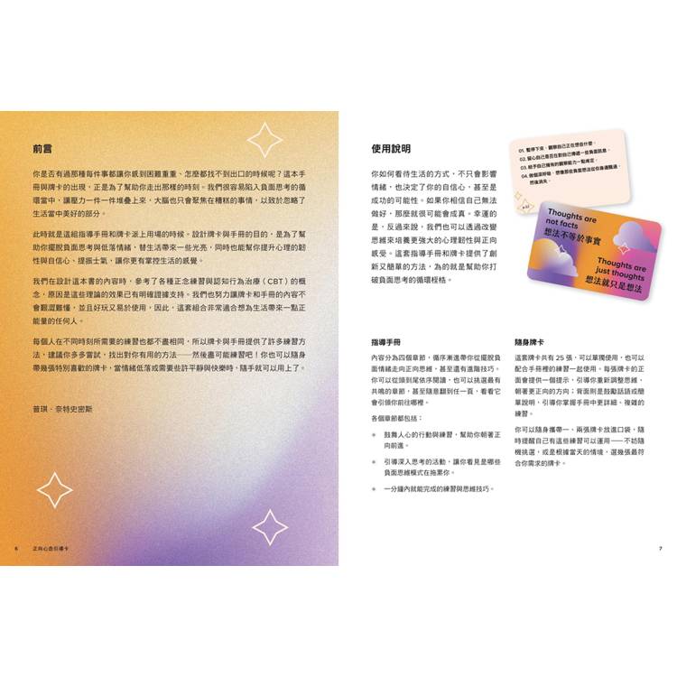 此時就是這組指導手冊和牌卡派上用場的時候。設計牌卡與手冊的目的,是為了幫助你擺脫負面思考與低落情緒,替生活帶來一些光亮,同時也能幫你提升心理的韌性與自信心、提振士氣,讓你更有掌控生活的感覺。