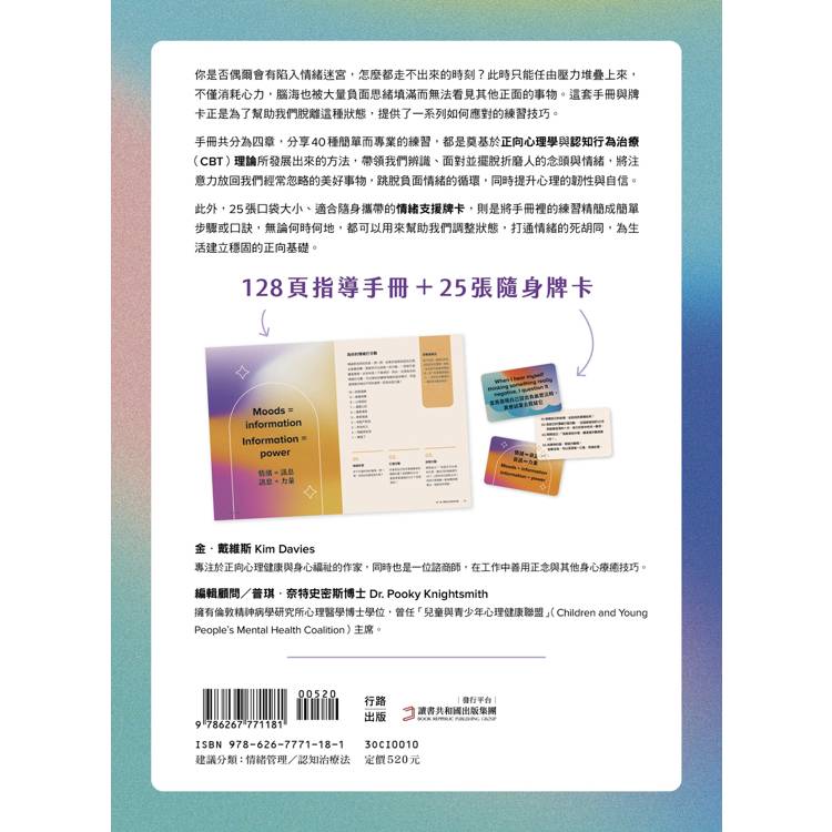 我們在設計這本書的內容時,參考了各種正念練習與認知行為治療(CBT)的概念,原因是這些理論的效果已有明確證據支持。我們也努力讓牌卡和手冊的內容不會艱澀難懂,並且好玩又易於使用,因此,這套組合非常適合想為生活帶來一點正能量的任何人。