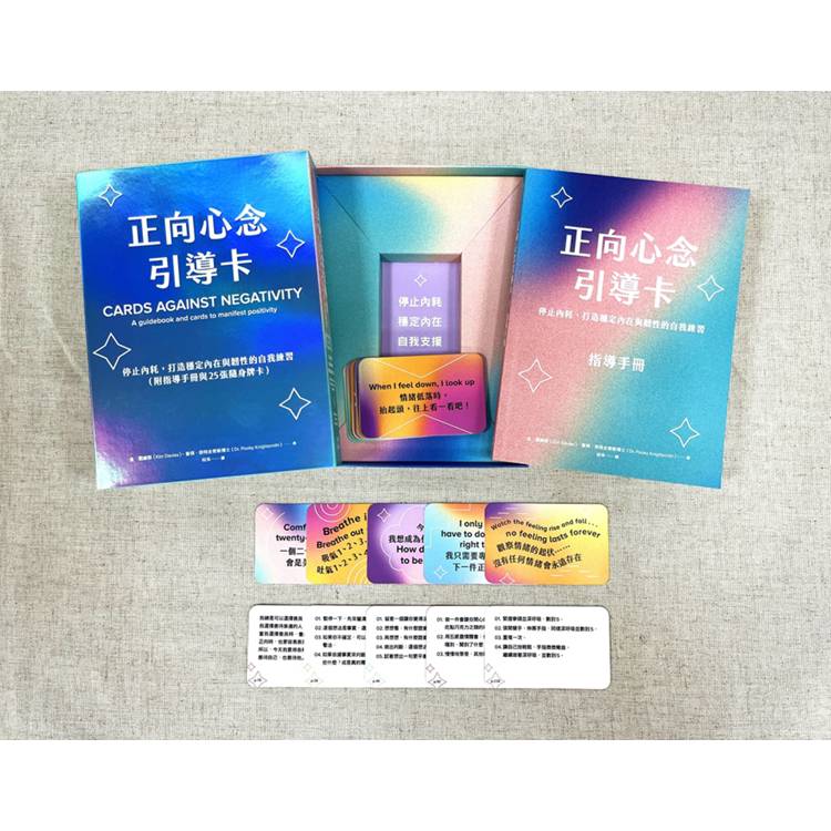 《正向心念引導卡》是由英國諮商師──金.戴維斯,以及擅長處理兒童和青少年心理健康議題的知名心理及精神疾病專家──普琪.奈特史密斯博士合作,針對現代人在生活中經常面臨的情緒低迷等問題,以「正向心理學」與「認知行為治療(CBT)」理論為基礎,設計出這套指導手冊與隨身牌卡,意在透過各種簡易的自我練習,帶領讀者逐步清理負能量,轉念正向思考。